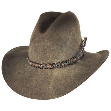 The Renegade by Bailey® Zella is a part of our dark horse collection. It features a gus crown with a classic shaped brim done in our sooty palamino color. Zella has a unique wash exclusive to Bailey that will allow you to have a one-of-a-kind style. Trimmed with a southwest band with braiding, turquoise studs, and a large guinea feather, the Zella stands apart from the other western hats.
