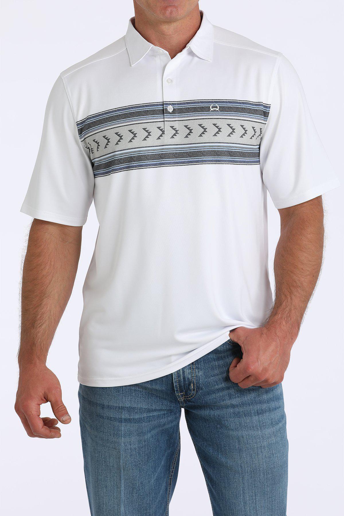 A subtle geometric print adds character to this sporty white printed polo engineered by CINCH. Stretch friendly poly-spandex construction features a logo heat transfer and traditional white buttons.