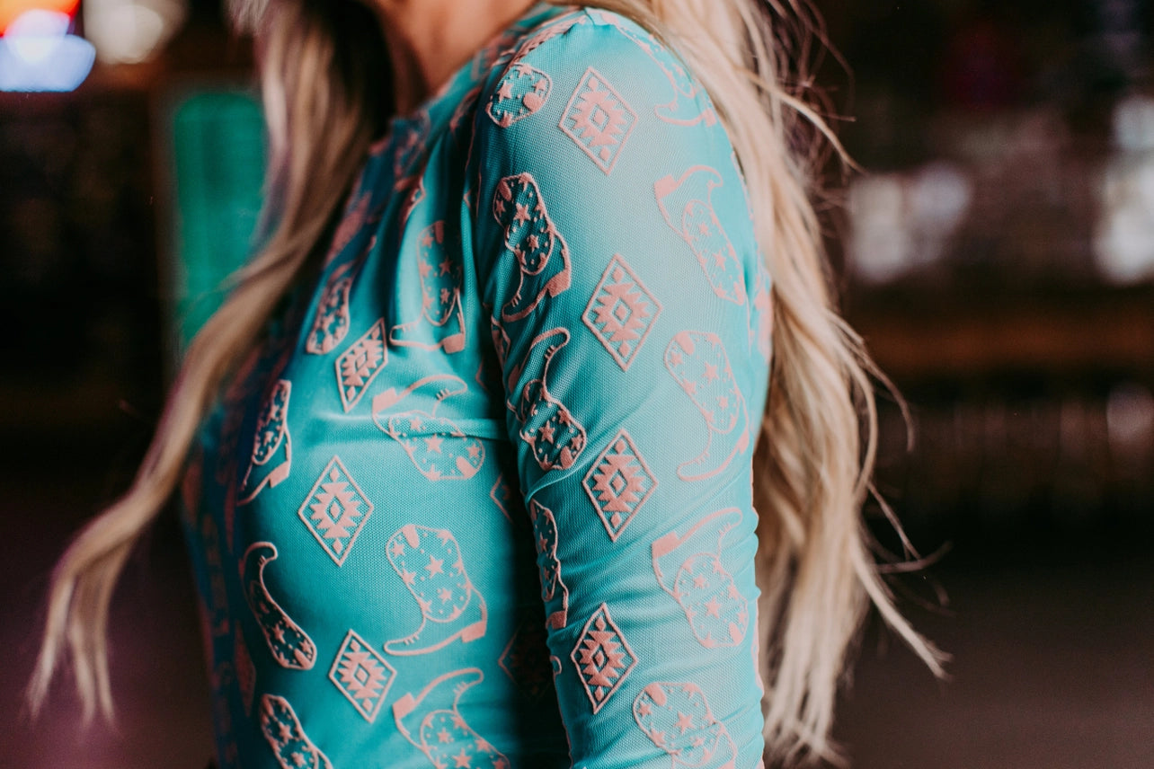 This slim fit blouse accentuates your figure. Turquoise body color with a pink boot and western design pattern. This sheer mesh fabric for a delicate and elegant touch. Classic crew neck neckline for a timeless and versatile style.